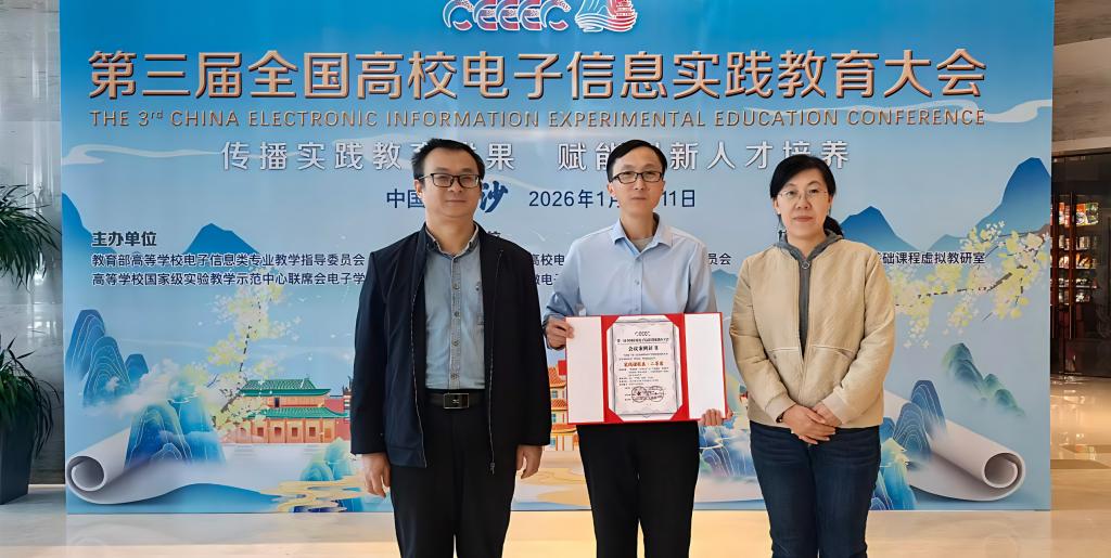 1月9日-11日,第三届全国高校电子信息实践教育大会在湖南长沙隆重召开,本次大会由教育部高等学校电子信息类专业教学指导委员会、高等学校国家级实验教学示范中心联席会电子学科组联合主办,聚焦“传播实践教育成果,赋能创新人才培养”主题,汇聚了全国各高校电子信息领域的专家学者、教学骨干,共同探讨实践教育改革路径,分享优质教学成果,推动电子信息类专业实践教育高质量发展。电工电子国家级实验教学示范中心主任吕常智、副主任马进、卢文娟一行参会。